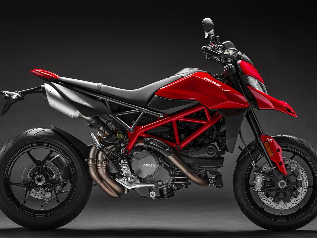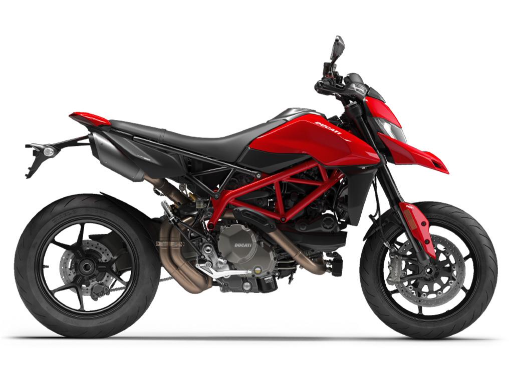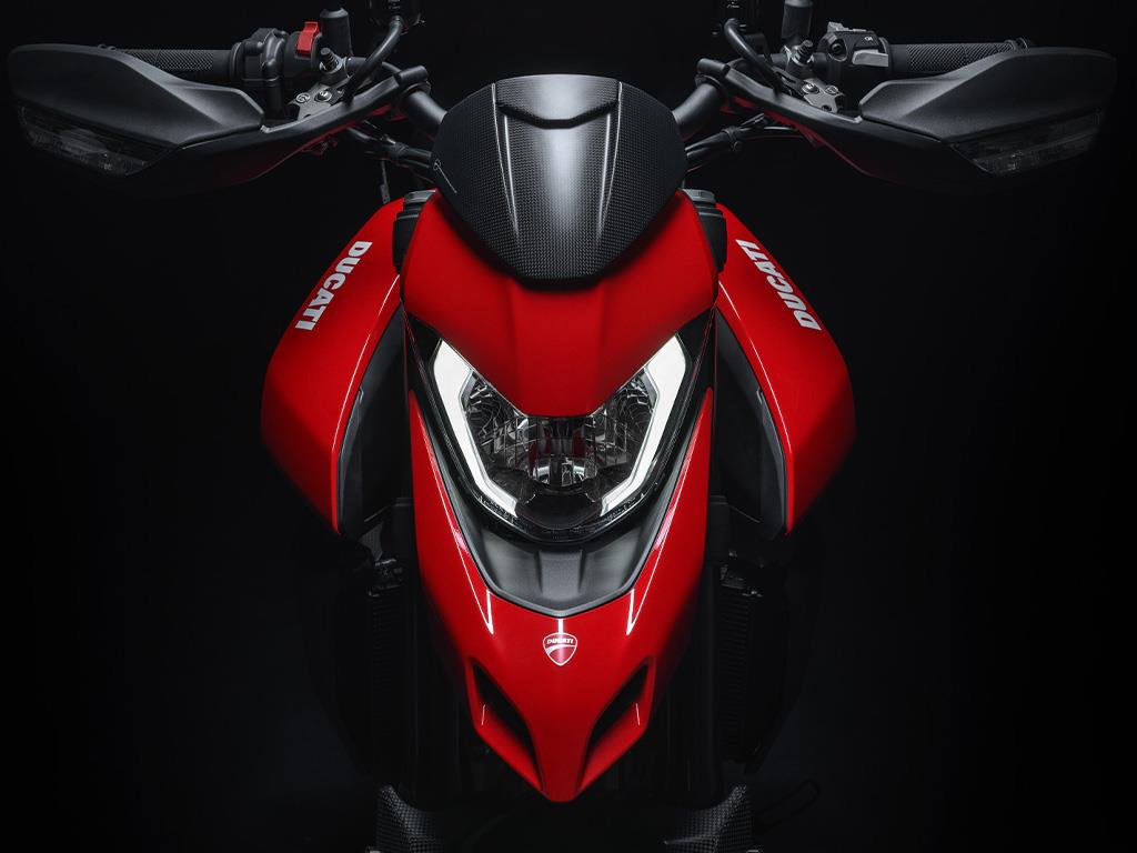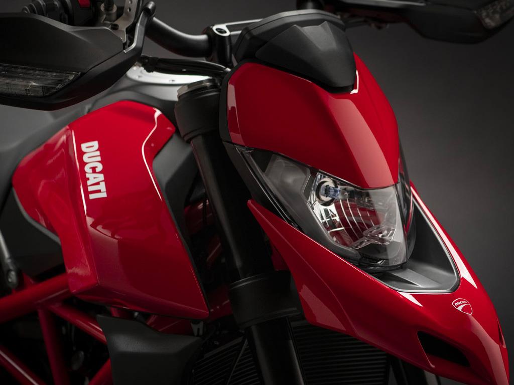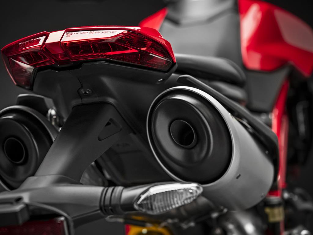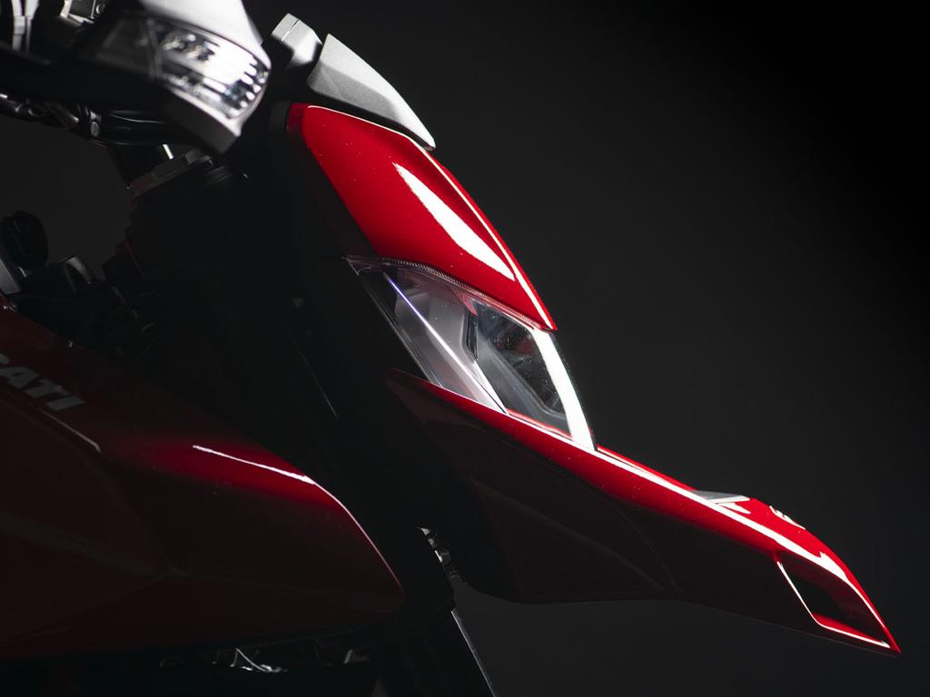 Traces of the motard racing world are visible in the high double exhaust, limited plastic superstructures, straight seat profile and the narrow, streamlined proportions of the motorcycle, which hint at an agile, adrenaline-fueled ride even when at a standstill.